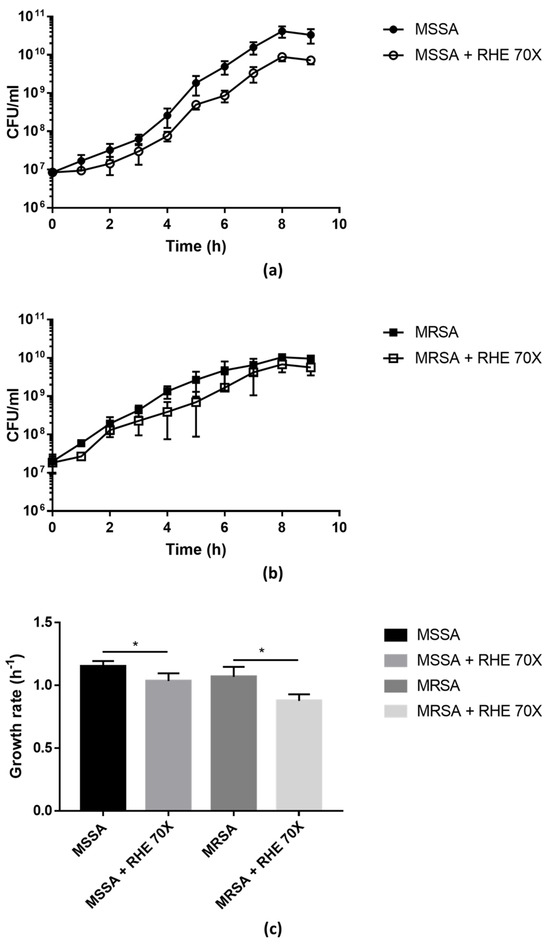 Growth curves of MSSA (a) and MRSA (b) isolates grown in absence/presence of RHE 70×. Colony-forming units (CFU) were counted after plating serial dilutions collected from the cultures every hour for the first 9 h. Growth rate (c) was calculated from the exponential phase of the growth curves. Each value represents the mean ± SD of three experiments. Growth rate in absence vs. presence of RHE 70× was analyzed by one-tailed t-test; * p < 0.05.