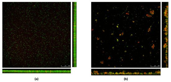 The 70× RHE was analyzed by CLSM; substantial differences were observed between the RHE-treated and the untreated biofilm. As shown in Figure 2a, in the untreated biofilm, bacterial cells formed a homogeneous layer, and were mostly green in color, indicating that the bacterial cells are intact and therefore viable. As shown in Figure 2b, when treated with RHE 70×, a loss of homogeneity in the biofilm layer was observed. Furthermore, aggregates of red-colored bacterial cells formed, meaning that the cells were not intact and therefore presumably dead.
