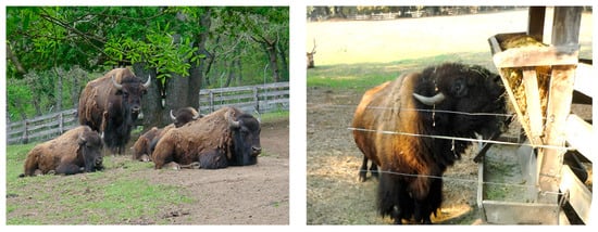 Seven captive bison (Bison bison) maintained in the Marcelle Natureza Zoological Park (Outeiro de Rei, Lugo; 43°4′14.71″ N, 7°37′53.50″ W; Spain) were utilized in the current study (Figure 2). These ruminants are maintained under continuous grazing in a 1-Ha fenced paddock with trees and grass. Nutritional supplementation consisting of pelleted feed is provided every 2 days, as well as hay during the winter. Feces is removed manually every 2–3 days prior to the visitors entering the park. Deworming involves the quarterly administration of anthelmintics (albendazole or ivermectin).