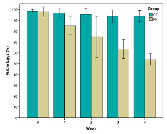 As illustrated in Figure 4, minor variations were observed in the percentages of viable eggs of Trichuris sp. in CF (control fecal samples), and values higher than 95% were achieved throughout a period of four weeks. In FF (fecal samples taken one week after bison received daily gelatins with fungal chlamydospores), viability decreased from 99% to 53% during the same interval, which means a viability reduction of 46%. These differences were statistically significant (Z = −5.734, p = 0.001).