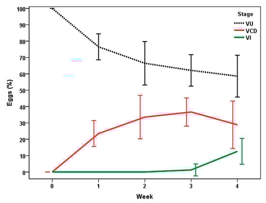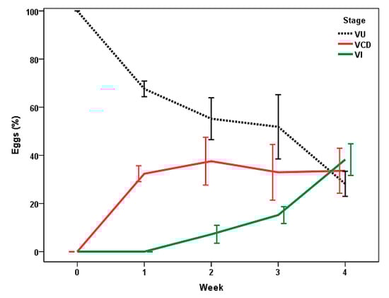 By the first week of the study (Figure 5), cellular development was recorded inside the eggs of Trichuris sp. in CF, with values around 32%. Infective eggs (VI, containing a L1 inside) were identified from the second week, with the maximal counts at the end of the study (near to 40%).