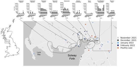 Location of wild birds testing positive for H5N1 HPAIV on the Solway Firth—Mapped position of H5 HPAI positive samples submitted to APHA for analysis. Regions of Barnacle Geese counts are shown with total counts for each region over the winter of 2021/2022 (adapted from []).