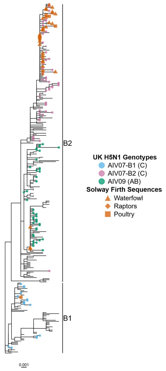 The UK and Europe poultry industry suffered considerably from the H5N1 HPAI outbreak. In the 2022 epizootic event, there were 119 incursions of H5N1 HPAI on commercial poultry premises (to 8 July 2022; Animal and Plant Health Agency, 2022), of which six were within our wider study area (Dumfries and Galloway in Scotland and Cumbria in England). Five of these produced viral sequences that were closely related to those concurrent in the wild bird population (AIV07-B2), supporting the association between disease in wild birds and commercial poultry HPAI (see Figure 3). This again highlights the necessity of good biosecurity practices on commercial premises to mitigate against incursion.
