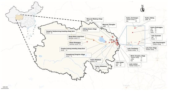 A comprehensive collection of 366 randomly obtained blood samples was assembled, representing a diverse range of livestock species, including 52 Tibetan sheep (Ovis aries), 67 goats (Capra hircus), 43 yaks (Bos grunniens), 49 cattle (Bos taurus domestica), 40 donkeys (Equus ferus caballus), 50 camels (Camelus bactrianus), and 65 horses (Equus asinus). These samples were gathered from 20 distinct locations situated within the Qinghai Plateau of QTPA (Figure 1). Prior to including livestock in this study, the farm owner was asked for their willingness to participate in the research activity and verbal consent was obtained.