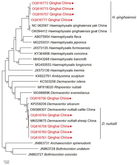 A light microscope was utilized for the observation of tick species under 40 × magnification. The results of the morphological identification of ticks revealed the detection mainly of two primary species within the Qinghai Plateau, namely H. qinghaiensis and D. nuttalli (Figure 2). A total of 23 ticks were submitted to the Genebank. After conducting rigorous sequence alignment analyses, our investigation has primarily provided evidence of the presence of two distinct tick species, H. qinghaiensis and D. nuttalli, in the Qinghai Plateau region, with nucleotide consistency levels ranging from 97.53–100% (Table 2). The results of the phylogenetic analyses indicate that based on the coxI gene, the tick species obtained in this study can be mainly classified into two clades: one clade is closely related to H. qinghaiensis, while the other is closely related to D. nuttalli from China (Figure 3). In this investigation, we have observed that OQ816756 exhibits notable dissimilarity when compared to the D. nuttalli and D. silvarum clade. It is suggested that OQ816756 could potentially represent novel variants within the Dermacentor genus.