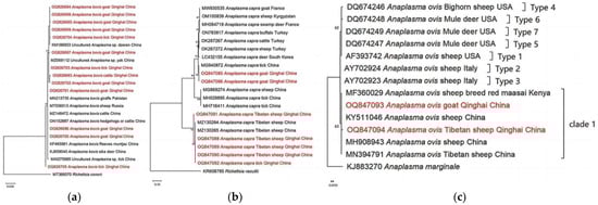 Based on our analyses of the 16S rRNA gene, the isolates of A. bovis obtained from goats, cattle, and ticks exhibited a close genetic relationship with previously reported A. bovis isolates. However, it is noteworthy that the isolate OQ826705 displayed distinct dissimilarity compared to A. bovis, suggesting its potential classification as a novel variant within the species A. bovis (Figure 4a). Additionally, our phylogenetic analyses based on partial sequences of the citrate synthase gene (gltA) revealed interesting findings. They showed that A. capra isolates obtained from goats in our study are genetically related to A. capra isolates previously detected from ticks in China [46]. Moreover, the analyses demonstrated that A. capra isolates derived from Tibetan sheep and ticks are positioned within the same clade as Tibetan sheep isolates obtained from Qinghai, as reported by He et al. [47]. These results suggest a genetic similarity and potential association between A. capra variants found in Tibetan sheep, ticks, and the Tibetan sheep population from the Qinghai region (Figure 4b). Moreover, our phylogenetic analyses of A. ovis, based on the Major surface protein 4 (msp4) partial sequences obtained from Tibetan sheep and goats, revealed the presence of a new clade, distinct from those previously identified in a study conducted by de la Fuente et al. [48] (Figure 4c).