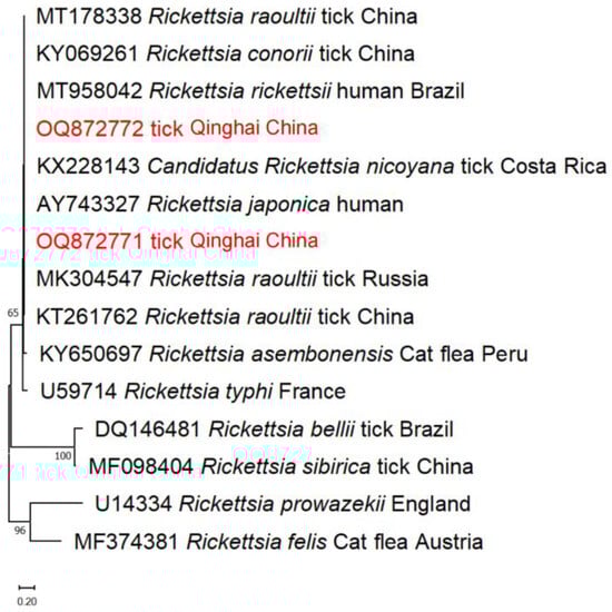 Based on the results of this study, only two instances of Rickettsia spp. infection were detected in the ticks. Detailed analyses of the genetic sequences unveiled 100% similarity between the positive sequences and the previously identified R. raoultii isolates originating from Russia and China. It is worth noting that earlier studies had already established the presence of R. raoultii in ticks from the Qinghai province [19,27,28], further confirming our findings.
