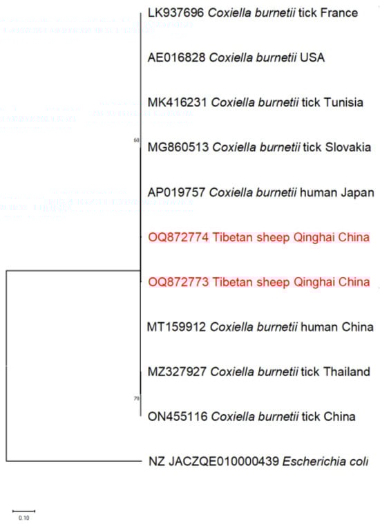 The findings regarding C. burnetii reveal that Tibetan sheep and ticks in Qinghai demonstrate a seropositivity rate of 0.5% (2/428). It is noteworthy that the sequencing analyses revealed a remarkable 99.69% similarity to the tick sample obtained from Tunisia (MK416231). This finding differs from the strain of C. burnetii previously detected in ticks from the Qilian area of Qinghai province [13]. Moreover, phylogenetic tree analyses further establish that these organisms belong to the same clade as those found in foreign nations, strongly suggesting the possibility of pathogen importation from other countries. The identification of C. burnetii in neighboring provinces [59,60,61] and the Qinghai Plateau implies the widespread presence of this bacterium in diverse geographical regions, indicating its potential for transmission to both animals and humans across a broader geographic scope.