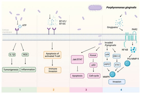 Previous studies indicate that P. gingivalis can promote tumorigenesis by influencing various signaling pathways (Figure 1): (1) Upon infection of the host by P. gingivalis, the B7-H1 receptor can be activated, facilitating the apoptosis of activated T cells. The increased expression of B7-H1 receptors in host cells may impact the persistence of inflammatory illnesses [57]. (2) Nucleoside Diphosphate Kinase (NDK), which is the effector protein produced by intracellular P. gingivalis, can block the signaling of extracellular adenosine triphosphate (ATP)/purinergic receptor (P2X7) on macrophages by consuming ATP. This prevents inflammasome activation and the secretion of interleukin-1β (IL-1β), consequently facilitating the process of tumorigenesis [58]. The NDK enzyme is also known to phosphorylate heat shock protein 27 (HSP27), and it is capable of triggering antiapoptotic processes upon phosphorylation [59]. (3) P. gingivalis activates antiapoptotic pathways, such as Janus kinase 1 (JAK1)/signal transducer and activator of transcription 3 (STAT3) and phosphoinositide 3-kinase PI3K/protein kinase B (Akt) in oral epithelial cells, thus promoting OSCC [60]. Besides inhibiting the intrinsic apoptosis of the invaded epithelial cells, P. gingivalis can also enhance the progression of the S phase of the cell cycle by inhibiting the p53 tumor suppressor gene (TSG) through the FimA adhesin [61]. Expression of the aforementioned B7-H1 receptor can inhibit the effector T cells by inducing regulatory T cells, which is beneficial for the invaded cell survival [57,62]. Due to the induction of regulatory T cells by the B7-H1 receptor, the immune system is (partly) evaded. (4) The activation of extracellular signal-regulated kinase 1/2 (ERK1/2)-protein ETS1, p38/HSP27, and PAR2 (protease-activated receptor 2)/nuclear factor kappa B (NF-κB) pathways was observed in response to P gingivalis infection, leading to the induction of pro-matrix metalloproteinase-9 (pro-MMP-9) expression, hence the increasing levels of MMP-9 and enhanced cellular invasion [63,64,65].