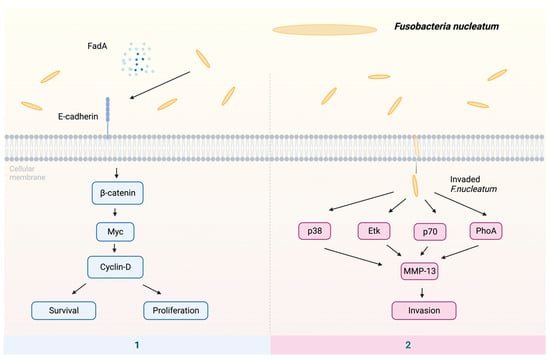 The potential mechanisms of F. nucleatum in cancer: (1) The virulence factor FadA binds to E-cadherin, subsequently activating β-catenin. This activation, in turn, triggers the transcription factor Myc, leading to the activation of cyclin-D. The activation of cyclin-D stimulates host cell survival and proliferation. (2) F. nucleatum enhances invasion by activating p38, Etk, p70, and RhoA, resulting in the upregulation of MMP-13. Abbreviations: Etk—tyrosine kinase; FadA—Fusobacterium adhesin A; MMP-13—matrix metalloproteinase-13; p38—protein kinase; p70—S6 kinase; RhoA—kinase.