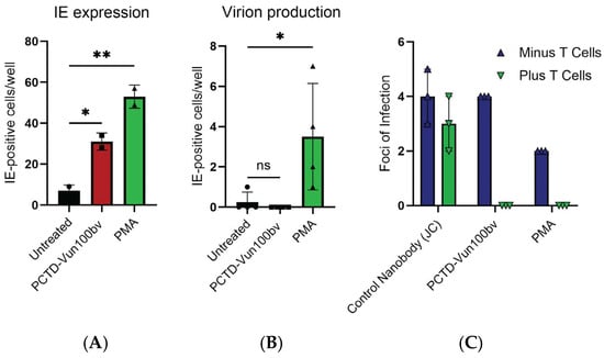 Previously, we have shown that the PCTD-Vun100bv treatment of monocytes experimentally infected with PCTD-Vun100bv leads to transient IE gene expression and that the recognition of cells transiently expressing IE genes by HCMV-specific T cells leads to their death [25,26]. However, we wanted to test whether such immune targeting of naturally latently infected CD14+ cells with PCTD-Vun100bv was also possible. To do this, CD14+ monocytes were isolated from the total peripheral blood mononuclear cells (PBMCs) of a seropositive individual and then treated with PCTD-Vun100bv, a non-targeting US28 nanobody control nanobody (JC), or PMA. CD14+ cells were then co-cultured with autologous T cells from that same individual. After removing the T cells, the CD14+ cells were induced to reactivate with GM-CSF and IL-4, followed by LPS, as previously described [27]. The levels of surviving HCMV-infected CD14+ cells were assessed by the formation of foci of infection in fibroblast co-cultures. Figure 4C shows that naturally latently infected cells treated with PCTD-Vun100bv showed no infectious foci of infection, consistent with the view that naturally latent cells treated with PCTD-Vun100bv show a transient increase in IE gene expression. These IE-expressing cells can then be recognised and killed by the autologous T cells, resulting in few to no residual latent cells (Figure 4C).