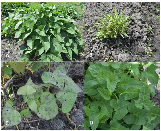 Virus symptoms in sweetpotato plants observed in farmer’s fields: (A) healthy sweetpotato crop; (B) stunting; (C) chlorotic ring spot and purpling; (D) chlorosis and vein banding.