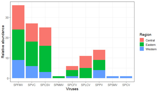 Frequency of different sweet potato viruses detected across survey regions (Central, Eastern and Western). The viruses detected include SPFMV (sweet potato feathery mottle virus), SPVC (sweet potato virus C), SPCSV (sweet potato chlorotic stunt virus), SPMMV (sweet potato mild mottle virus), SPCFV (sweet potato chlorotic fleck virus), SPLCV (sweet potato leaf curl virus), SPPV (sweet potato pakakuy virus), SPSMV_1 (sweet potato symptomless_1 virus) and SPCV (sweet potato collosive virus).