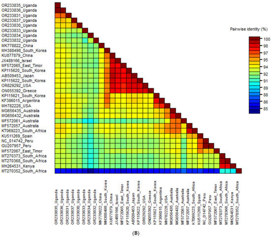 The phylogenetic analysis of the SPVC polyprotein revealed five distinct phylogroups (I–V). Phylogroup I included sequences from multiple continents, such as Asia, South America, North America and Europe, showing the highest diversity with three sub-clusters and two sequences that did not cluster well with others. SPVC-II comprised sequences exclusively from Uganda in this study, forming two sub-clusters distinct from other sequences. SPVC-III predominantly included sequences from Australia and one sequence from South Africa, further subdivided into two clusters. SPVC-IV consisted of sequences from South America (Peru), Europe (Spain) and East Timor (Asia). Phylogroup SPVC-V exclusively contained sequences from Africa (Kenya and South Africa) (Figure 5A). Within SPVC, nucleotide sequence similarity ranged from 88% to 99% (Figure 5B).