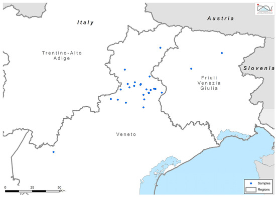 Samples were collected in North-East Italy. This area is divided into three administrative regions: Veneto, Trentino-Alto Adige and Friuli Venezia Gulia. The area is characterized by pre-Alpine and Alpine areas, a sub-continental climate, a relatively high humidity of around 85% and moderate precipitation of around 1000 millimeters per year [15,16].