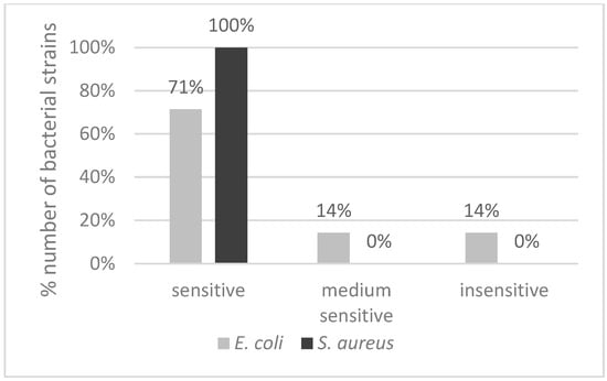 The sensitivity of E. coli and S. aureus bacterial strains to anti-mastitis bacteriophage cocktail presented as % number of strains that are sensitive, medium sensitive, or insensitive among all tested strains.