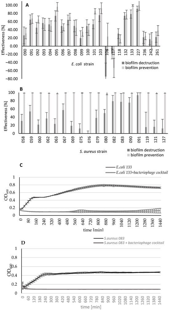 The effectiveness of bacteriophage cocktail in biofilm prevention and eradication for E. coli (A) and S. aureus (B) strains. The growth curves of E. coli 133 (C) and S. aureus 083 (D) cultures with an anti-mastitis phage cocktail.