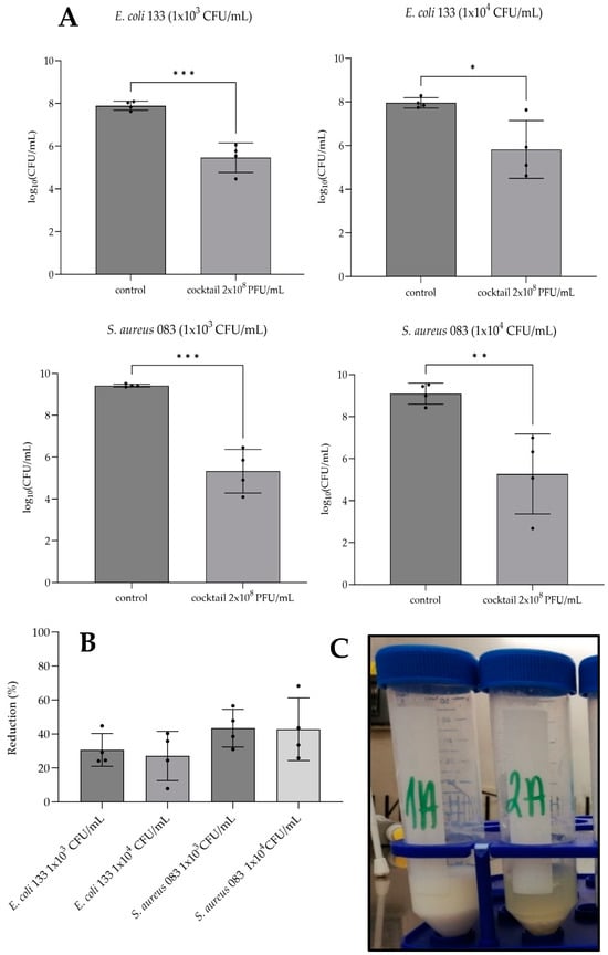 In this study, two representative strains (E. coli 133 and S. aureus 083) were used. The effectiveness of the bacteriophage cocktail in bacteria eradication in the milk environment was defined as % of log of bacteria number reduction compared to the log number of bacteria in the control sample assumed as 100%. Two different initial bacterial densities were tested (1 × 103 CFU/mL and 1 × 104 CFU/mL). Differences in Log10(CFU/mL) for each strain and initial bacterial density tested compared to control samples with SM buffer are presented in Figure 6A. The applied phage cocktail was more effective in reducing the number of S. aureus 083 reaching 43% reduction (p < 0.001 for 1 × 103 CFU/mL and p < 0.01 for 1 × 104 CFU/mL), while for the E. coli strain, the reduction ranged approximately 30% (p < 0.001 for 1 × 103 CFU/mL and p < 0.05 for 1 × 104 CFU/m). In control samples, after 24 h incubation, bacterial growth was observed in the range of 4 × 107 CFU/mL to 2 × 108 CFU/mL for E. coli and 3 × 108 CFU/mL to 3 × 109 CFU/mL for S. aureus. The initial bacterial density values had no impact on the effectiveness of the cocktail used (Figure 6B). In addition, the difference in the appearance of milk samples artificially infected with S. aureus between treated or not treated with the phage cocktail was observed (Figure 6C). Precipitation of milk proteins was observed in samples without phages.