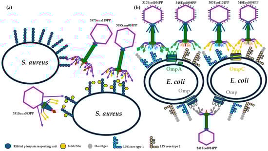 Further bioinformatic analyses allowed for the detection of the receptor-binding proteins for all analyzed phages, which in turn allow for the reconstruction of the phage’s receptor binding systems and the uncovering of the action of our phages in the first stage of infection (publication under preparation). In the case of phages attacking Gram-positive bacteria (351Saur083PP, 355Saur083PP, and 357Saur119PP), the analysis predicted affinity to the wall teichoic acids (WTA) decoration sugar (Table 5). The bioinformatic prediction suggests that Rosenblumvirus 351Saur083PP and Kayvirus 355Saur083PP recognize the same sugar motif but attach it by different proteins and mechanisms. Moreover, these phages use different supporting receptors to boost the attachment process. In the case of phage 357Saur119PP, which belongs to the same genus as 355Saur119PP, the bioinformatic studies detected crucial differences in receptor binding domains and suggested the recognition of other structural motifs (publication under preparation).