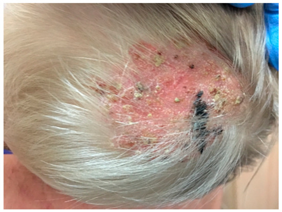 Ringworm of the scalp caused by T. verrucosum (courtesy of Honorata Kubisiak-Rzepczyk).