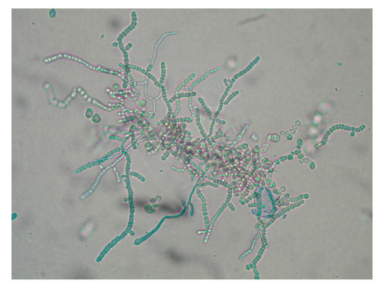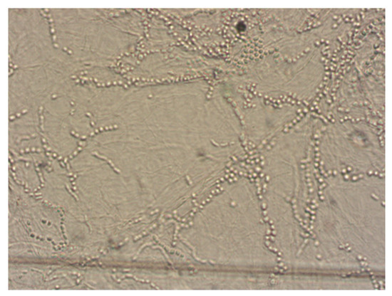 The direct microscopic examination allowed for the identification of structural elements (hyphae and/or spores) in 26 patients (65%) (Figure 8 and Figure 9). A positive T. verrucosum result was found in 25 patients, and T. mentagrophytes was positive in only one case. The microscopic image of T. verrucosum showed microconidia forming chlamydospores in the form of long chains. In the case of T. mentagrophytes infection, microconidia were arranged singly along unbranched hyphae. In order to identify the dermatophyte species, the culture was performed regardless of the direct examination result. T. verrucosum was confirmed in 39 patients (97.5%), and T. mentagrophytes infection was diagnosed in one patient. The highest incidence of infection occurred in late autumn and winter. All patients with T. mentagrophytes and T. verrucosum infections came from the same geographical area and the same climatic conditions.