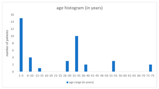 This study involved 40 people, cattle breeders and their family members, aged from 1 to 75 years. The average age of all patients was 21 years. Children constituted half of the study population. Among them, the largest group consisted of 15 children aged up to 5 years. Men predominated and constituted 60% of the study group (24 patients). In adulthood, dermatophytosis was most often observed between the ages of 31 and 35 (Figure 6).