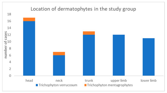 A detailed analysis of skin infections made it possible to determine the frequency of dermatophytes in specific parts of the body. Dermatophytosis was present only in one location in 14 patients. The distribution of skin mycosis in two locations was observed in nine cases, and in three places in the remaining three patients. The most common site of T. verrucosum infection was the stomach, followed by the hairy scalp, back, neck and thigh. Subsequently, less numerous skin lesions caused by this dermatophyte were observed in other parts of the body. T. mentagrophytes diagnosed in one patient was localized on the skin of the cheeks, neck, chest, stomach and back (Table 2).