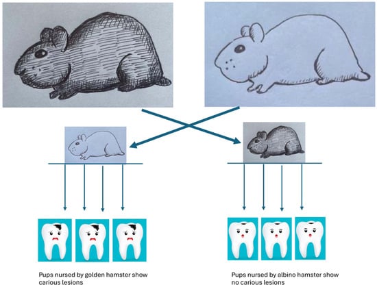 Illustration of the Golden and Albino Hamster experiments showing transmission from mother to child. Golden Hamster Dame (caries positive) is on the left, and Albino Hamster Dame (caries negative) is on the right side. Hamster pups are delivered in a sterile chamber by cesarian section under sterile conditions, and then albino pups are put in the cage of the Golden Hamster pups to be suckled by the Albino Dame (bottom right side of illustration) while the albino pups are suckled by the Golden Hamster Dame (bottom left side of the illustration). As shown, the Golden pups have no caries now (bottom right), while the albino pups have caries (bottom left).