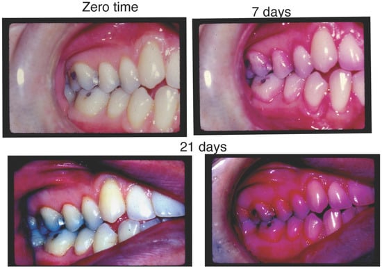 These understandings re-awakened interest in the movement of bacteria from oral to distant sites []. Local destruction was thought to result from the direct result of bacterial by-products such as enzymes, toxins, etc., or from an overactive host response initially designed to stem the tide in favor of healing []. However, many believed that an excessive host response could also be responsible for local tissue destruction and/or disease. The experimental gingivitis model of Harald Löe and colleagues provided a close examination of the chronological association of oral bacteria in supragingival plaque and the coordinated dysregulation of the host response to accumulating bacteria [] (Figure 2). In the figure above, a dental student abstained from all oral hygiene for a 3-week period, and both gingival and plaque indices were recorded at 7, 14, and 21 days after abstention. In addition, after this 21-day period, the student brushed and flossed their teeth, and the plaque and its resulting gingivitis returned to pre-abstention levels. The figure above illustrates the dramatic changes resulting from abstinence from oral hygiene (Figure 2).