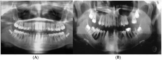Panoramic radiographs of cases of aggressive periodontitis in adolescents. Panel (A) shows a panoramic view of excessive bone loss in the first molars and no carious lesions. Panel (B) shows more extensive disease in an adolescent with bone loss around the molars and missing molars and incisors with occlusal, but proximal decay is related to a blow-out occlusal lesion in the mandibular right second molar.