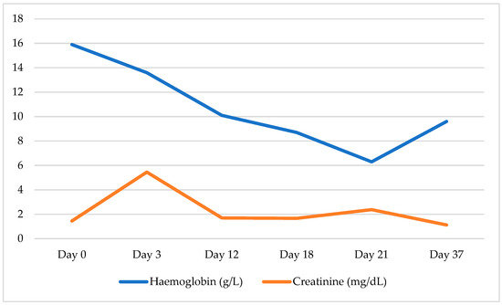 Haemoglobin and creatinine levels in the course of infection.