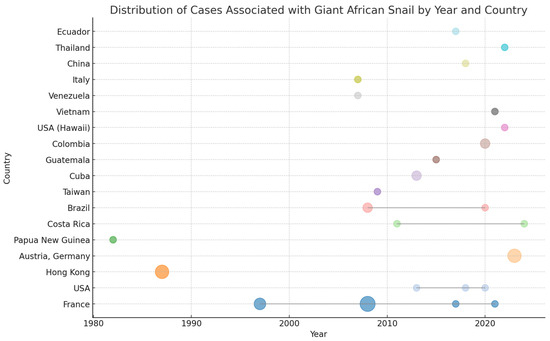 Villanueva Parra, I.; Muñoz Diaz, V.; Martinez Guevara, D.; Cruz Mosquera, F.E.; Prieto-Alvarado, D.E.; Liscano, Y. A Scoping Review of Angiostrongyliasis and Other Diseases Associated with Terrestrial Mollusks, Including Lissachatina fulica: An Overview of Case Reports and Series. Pathogens 2024, 13, 862. https://doi.org/10.3390/pathogens13100862