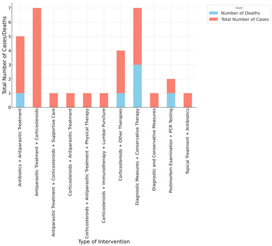 | Authors and Year of Publication | Country | Type of Study | Total Number of Cases | Age | Type of Exposure | Disease and Causative Species | Category of Symptoms | Type of Diagnostic Methods | Type of Intervention | Treatment Effectiveness | Reported Side Effects | Number of Deaths | Conclusions |