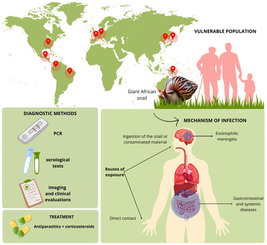 - Gippet, J.M.W.; Bates, O.K.; Moulin, J.; Bertelsmeier, C. The Global Risk of Infectious Disease Emergence from Giant Land Snail Invasion and Pet Trade. Parasit. Vectors 2023, 16, 363. [Google Scholar] [CrossRef]