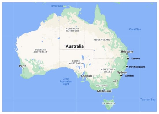 Geographical location, in New South Wales, Australia, from which urogenital tract swabs of koalas (Phascolarctos cinereus) were obtained to investigate for the presence of Coxiella burnetii DNA. The study locations (Lismore, Port Macquarie, and Camden) are indicated by solid dots on the above map.