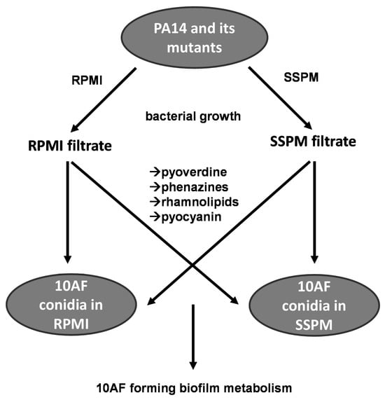 Experimental workflow diagram. Bacteria were grown in RPMI or SSPM at 37 °C and 100 rpm for 24 h before measuring growth. Sterile filtrates were prepared and tested for (arrows) pyoverdine, phenazine, rhamnolipid, and pyocyanin content as described in the Materials and Methods section. Effects of filtrates on fungal biofilm formation were tested in RPMI, SSPM, or a mixture of both media.