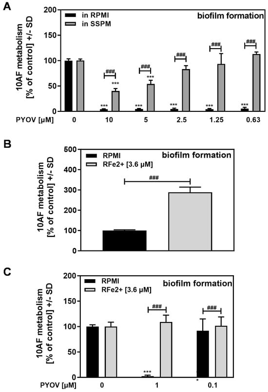 To decide if the presence of ferrous iron interfered with the anti-fungal activity of pyoverdine, we supplemented RPMI with 3.6 µM ferrous iron. Supplementation with ferrous iron increased the fungal biofilm metabolism in RPMI by about the same amount as seen for SSPM, compared to unmanipulated RPMI (compare Figure 5B to Figure 4A). Normalized to the unmanipulated fungal metabolism in the respective medium (= 100%), pyoverdine in RPMI ≥1 µM abolished biofilm metabolism, whereas ferrous iron in RPMI neutralized the anti-fungal activity of pyoverdine (Figure 5C).