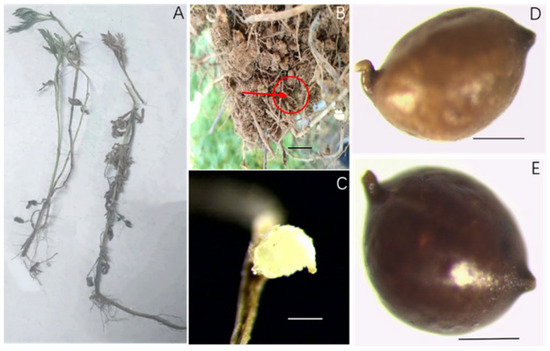 Light micrographs of the rhizosphere cyst of Artemisia lavandulaefolia DC. (A). A. lavandulaefolia DC.; (B,C). Females on A. lavandulaefolia DC.; (D,E). Cyst (Scale bar: (B) = 1 cm; (C–E) = 200 µm).