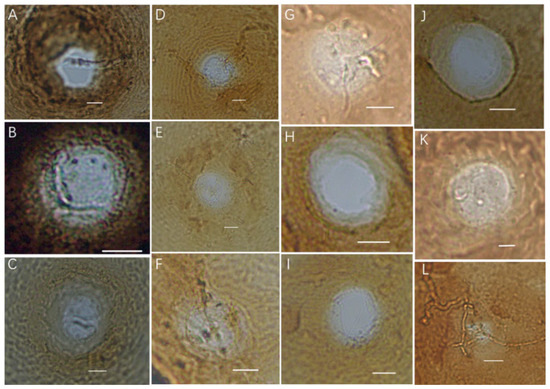 Light micrographs of vulval cones of the cyst population. (A–G,L). Circumfenestrate (with underbridge); (H–K). Circumfenestrate (without underbridge) (Scale bar: (A–J) = 10 μm; (K) = 5 μm; (L) = 20 μm).