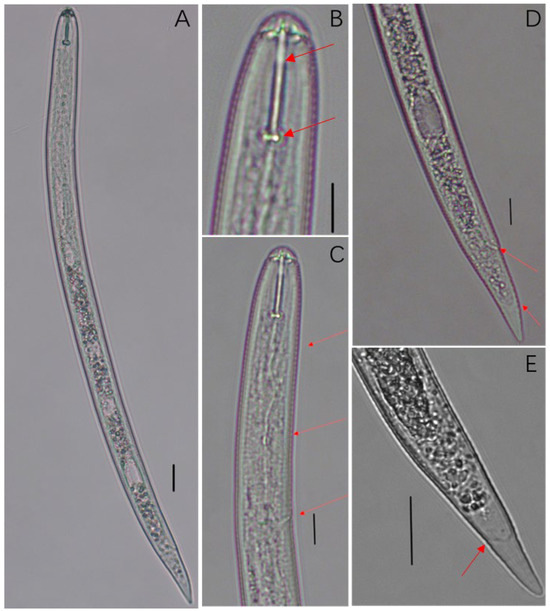 Light micrographs of second-stage juvenile of the population. (A). Entire body; (B). Stylet; (C). Anterior region of second-stage juvenile; (D). Tail region of second-stage juvenile; (E). Tail (Scale bar: (A) = 20 μm; (B–D) = 10 μm; (E) = 20 μm).