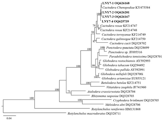 This study obtained a total of four D2–D3 region of 28S rDNA sequences from cyst populations, with a length of 577 bp and GenBank accession numbers of OQ625739, OQ626201, OQ626167, and OQ626168, respectively. Four ITS rDNA region sequences, with a length of 906 bp and GenBank accession numbers OQ625810, OQ625811, OQ625812, and OQ625813, were also obtained.