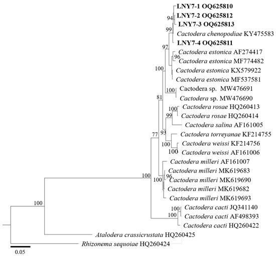 In the phylogenetic tree of the ITS rDNA region (Figure 5), the four cyst populations in this study clustered with one cyst from the gene pool of Liaoning C. chenopodiae to form an independent evolutionary branch, with a confidence level of 99%. The BLAST alignment results of the ITS rDNA region showed that the sequence similarity between the four spore sac populations in this study and this nematode population (KY475583) was high, at 100%.