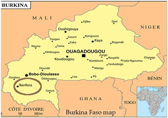 - INSD (Institut National de la Statistique et de la Démographie). Résultats Cinquième Recensement Général de la Population et de L’habitation: Monographie de la Région des Cascades; Institut National de la Statistique et de la Démographie: Ouagadougou, Burkina Faso, 2022; 192p, Available online: http://www.cns.bf/IMG/pdf/monographie_des_cascades_5e_rgph.pdf (accessed on 12 December 2023).
