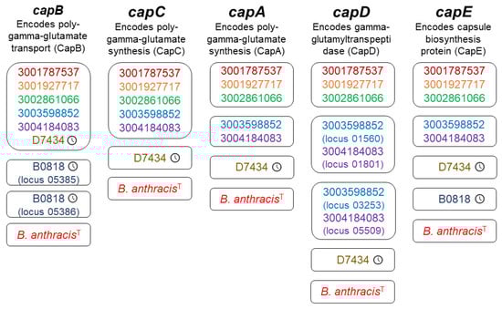 Archival isolates B0818 and D7434 received two and five capsule gene annotations, respectively. B0818 received two sequential capB annotations (loci 05385 and 05386). Both annotated sequences shared relatively high amino acid identity with the CapB reference sequence (73.8% and 80.3%, respectively) (WP_003159943.1) but were shorter than the expected 1395 bp, with locus 05385 consisting of 389 bp and locus 05386 consisting of 623 bp (Table 1). Upon inspection of the B0818 sequences aligned with the reference sequence in MEGAX [87], it appeared that the full gene was interrupted by a stop codon. The capE annotation for B0818 had only 52% amino acid identity with the reference (WP_003159943.1) but was of appropriate length (140 bp compared to the 143 bp reference sequence) and was on the same contig as the capB annotations for this isolate (Table 1). Archival isolate D7434 received annotations for a complete capsule operon, capBCADE, as did all five contemporary isolates. All six isolates had capB sequences group together in a single protein cluster (Figure 2). D7434’s sequences had their own cluster for capCADE (Figure 2). The sequences for capA and capD both fell to 60% and 57% amino acid identity with the reference sequences (Table 1). This was a deviation from the other cap annotations in D7434 and all cap annotations in the contemporary isolates, which ranged from 79 to 92% (Table 1). All contemporary isolates shared a single protein cluster for capC (Table 1). The contemporary B. nitratireducens and B. paranthracis isolates formed separate protein clusters for capADE (Figure 2). The contemporary B. paranthracis isolates had two capD annotations each, which formed their own clusters (Figure 2). Upon closer inspection, capD was split identically in both isolates. There was no evidence of a split in the archival B. paranthracis, which was isolated in 1968. There were no geographic patterns reflected in these data.
