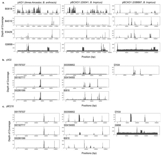 Depth of coverage for sequencing reads aligned to reference sequences. Cleaned sequence reads were aligned to reference sequences with bowtie2 to visualize the breadth (horizontal) and depth (vertical) of coverage for inferring replicon presence/absence. (a) pXO1 from B. anthracis Ames Ancestor, pBCXO1 from G9241, and pBCXO1 from 03BB87. Only G9898 (bottom row) indicates the presence of a complete pXO1 homologous plasmid. (b) pXO2 from B. anthracis Ames Ancestor. The contemporary B. nitratireducens (3001787537, 3001927717, and 3002861066), contemporary B. paranthracis (3003598852 and 3004184063), archival B. cereus genome B0818, and archival B. paranthracis genome D7434 did not indicate the presence of pXO2 despite receiving annotations for the PGA capsule operon genes. (c) pBC218 from G9241. In the G9241 welder’s anthrax BCG genome, the bps exopolysaccharide capsule genes are housed on the pBC218 plasmid. Again, G9898 was the only genome showing evidence of containing a pBC218-like plasmid.