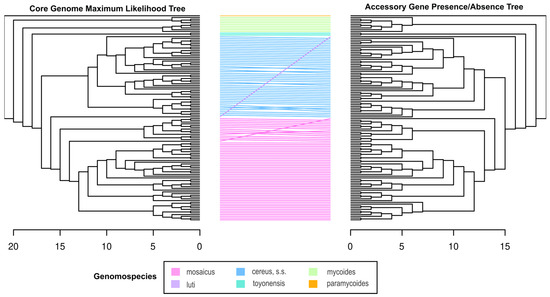Tanglegram comparing the core genome phylogeny and accessory gene presence/absence tree. The colors of the lines connecting the tree leaves represent the genomospecies classification of each clade according to the 2020 genomospecies classification scheme for the B. cereus group [81] as guided by the core genome phylogeny and the distribution of type strains. The scale bars indicate the height of each tree (the largest number of edges between the tree leaves and the root). While there is entanglement within the genomospecies clades, there is no entanglement between clades, indicating the accessory gene presence/absence tree largely recapitulates the topology of the core genome phylogeny.