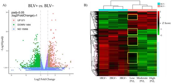 Differential gene expression analysis results. (A) Volcano plot displaying all the genes identified after sequencing in terms of −Log10(padj) and Log2 Fold change with thresholds for the DEGs set at >1.301 and <−1 or >1, respectively. The results display 571 upregulated and 1484 downregulated DEG in BLV+ vs. BLV− PBMCs. (B) Hierarchical clustering heat map from the results of the FPKM cluster analysis clustered using the log2(FPKM+1) value to compare gene expression between the six samples. Red indicates relative upregulation and green indicates relative downregulation. The yellow boxes highlight the gene clusters in the low-PVL sample that are dissimilar to the other BLV+ samples.
