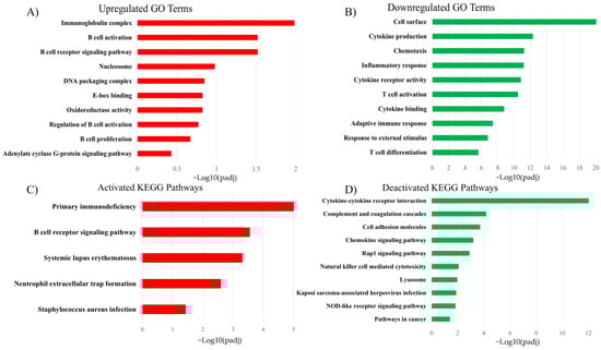 Bar graphs display the most significant functional analysis terms identified from the BLV+ vs. BLV− DEGs using the Gene Ontology and KEGG enrichment analyses. (A) Upregulated GO terms in BLV+ PBMCs. (B) Downregulated GO terms in BLV+ PBMCs. (C) Activated KEGG pathways in BLV+ PBMCs. (D) Suppressed KEGG pathways in BLV+ PBMCs.