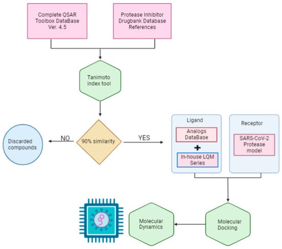 The scope of this research is to identify potential hit molecules and propose a therapeutic strategy aimed at inhibiting the major protease of SARS-CoV-2. Figure 1 shows the computational approach taken in this work to screen and evaluate two sources of molecular structure data: the public QSAR Toolbox database and our internal database. Our in-house collection of chemical compounds has been compiled over 30 years of research and currently contains 250 compounds spanning a wide range of structures, functional groups, and activities, including antiviral, antineoplastic, antihypertensive, antiparasitic, and other properties [37,38].
