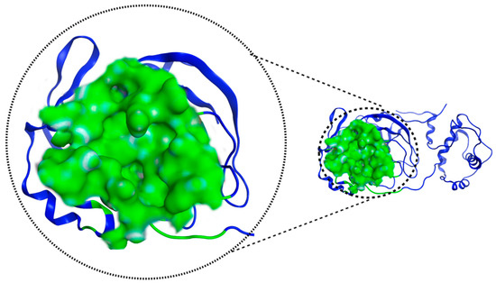 Structure of the SARS-CoV-2 Mpro protein. The possible interaction sites are colored green, and the rest of the protein is blue. Image created in the Molecular Operating Environment, MOE 2022.02.